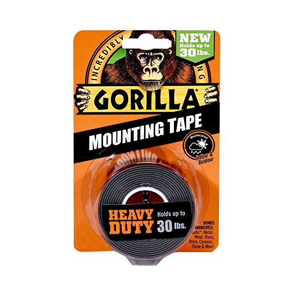 - Gorilla Heavy Duty Mounting Tape is a black, double-sided tape that mounts in an instant, for a long-lasting, weatherproof bond. Completing DIY projects is easy with this tough, double-sided tape. Assemble, build, repair and repeat!