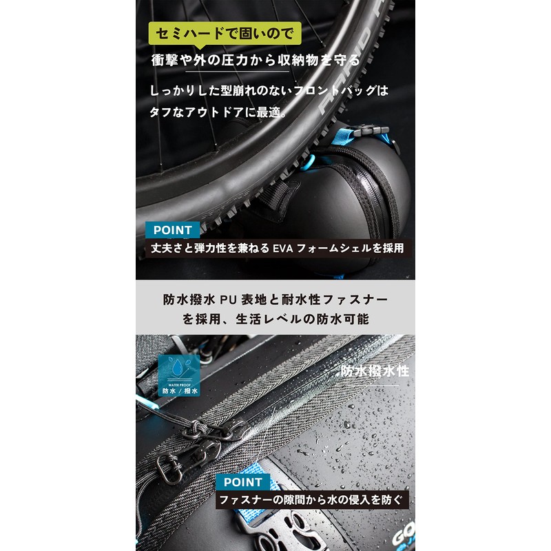 - [セミハード]セミハードタイプで衝撃や外の圧力から中の収納物を守ります。しっかりした型崩れのないフロントバッグはタフなアウトドアに最適。丈夫さと弾力性を兼ねるEVAフォームシェルを採用。
