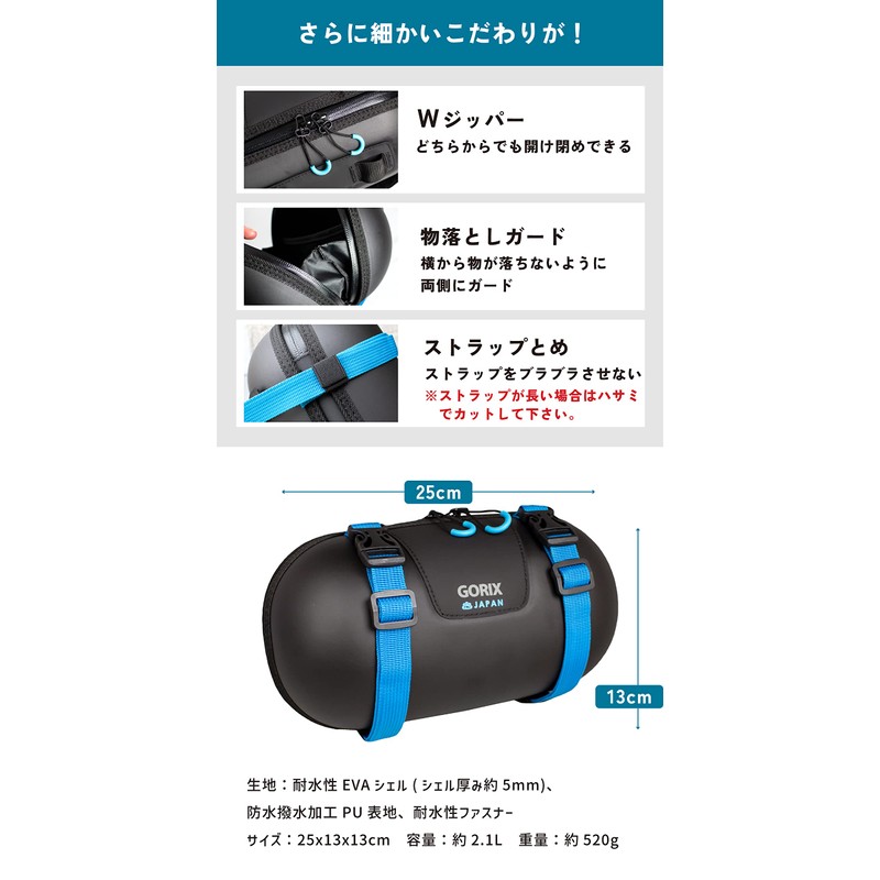 - 【商品内容】:自転車用フロントバッグ【生地】:耐水性EVAシェル(シェル厚み約5mm)、防水撥水加工PU表地、耐水性ファスナー【サイズ】:25x13x13cm【容量】:約2.1L【重量】:約520g