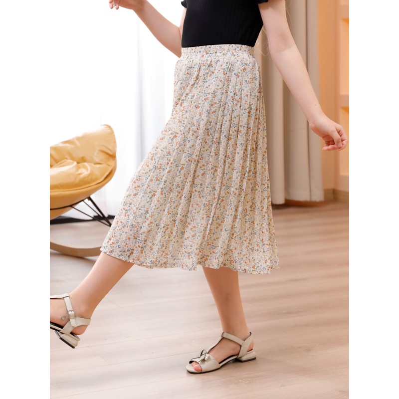 GORLYA Girls Chiffon Pleated Elastic High Waist A-Line Boho Swing Maxi Long Skirt 4-14T (GOR1115,14Y,BeigeFloral)