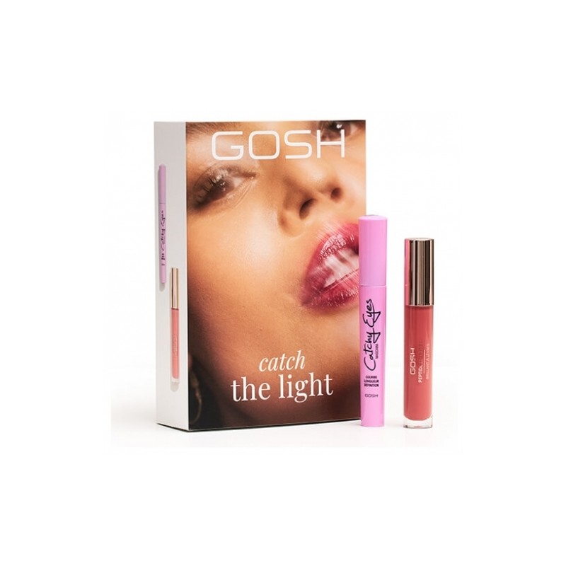 Discover the Catch the Light Gosh Set, a sensational make-up duo to illuminate your eyes and sublimate your lips. This set includes Catchy Eyes Mascara Allergy Certified Black and Gloss Lip Peptide Vintage Gosh. Catchy Eyes Mascara offers extreme volume, intense length and a pronounced curve. Its curved, banana-shaped brush ensures precise, clump-free application for a cat-eye effect. Its certified anti-allergy formula is suitable for all lash types, with a soft, creamy texture and long-lasting hold that resists rain, sweat and tears. Fragrance- and paraben-free, this mascara is also vegan. Its intense color and active ingredients such as Larch polysaccharide and castor oil ensure exceptional hydration, length and volume. For even more sublime lashes, combine with Gosh Pro Growth Serum.