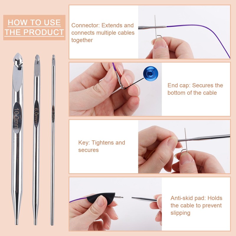 - Tunisian Crochet Hooks Set: Includes 12 crochet hooks, 4 cables, 4 end caps, 2 connectors, 2 keys, 1 non-slip spacer, a piece of cloth, and with a storage bag, designed to keep your hooks, cables, and accessories neatly stored and easy to carry anywhere you go.