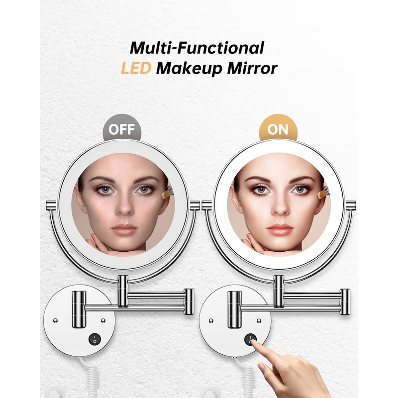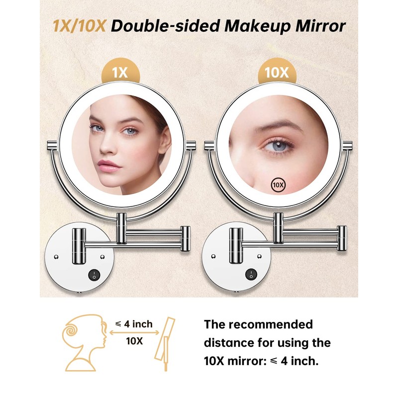 - 【UNDISTORTED 1x/10x MAGNIFIER & DUAL SIDES】- There are double sides of the 8.5" wide-angle wall mounted makeup mirror, featuring with 1x and 10x magnification. On the 10x magnifying side, each facial feature can be magnified and make sure that every detail of your hair and makeup are in place. You can get a distortion-free view of skincare, makeup and shaving. 1x magnifying side is a standard mirror, designed for your overall look.