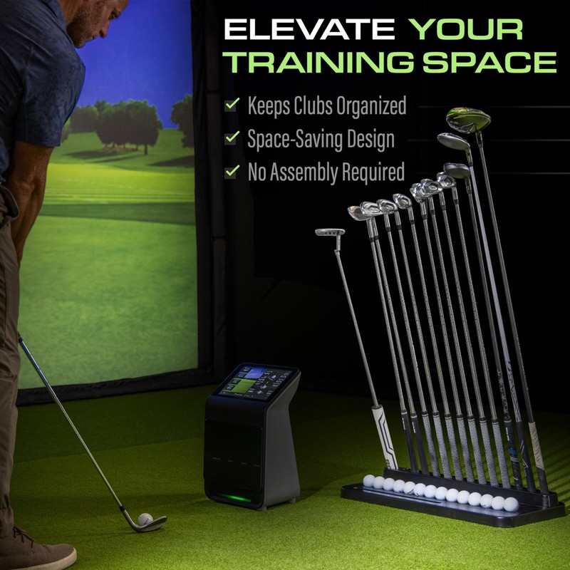 - ELEVATE YOUR TRAINING SPACE: Declutter and proudly display your clubs for a sleek setup that elevates at-home practice; Measures 26.5 L x 12 W x 2.5 H inches