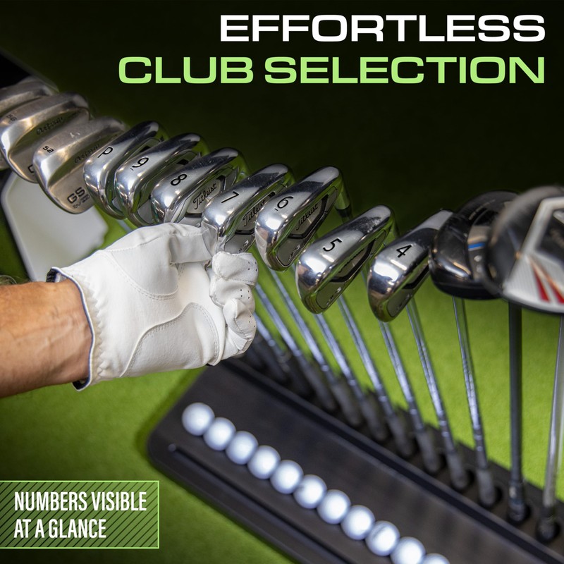- TIP-RESISTANT DESIGN: Solid non-tip base securely holds clubs with grips down and club numbers up for optimal club management; Quickly and easily select the club for your shot for seamless practice