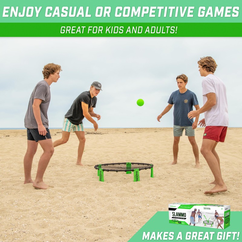 - WHAT IS SLAMMO: Slammo is an action-packed 2-on-2 volleyball style game where teams have 3 hits to return or spike the ball to the circular net; Fun for the whole family at the beach, BBQs, camping, and in the backyard