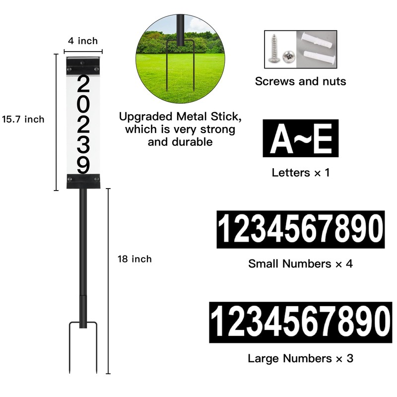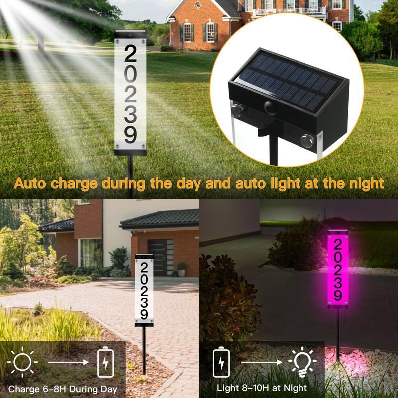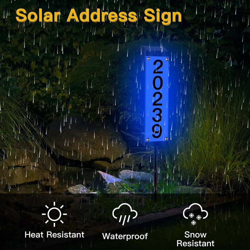- ☀【Modern Solar Address Sign】solar address signs for houses have modern design with acrylic, the size for the acrylic is 15.7*4 in, and the size for metal stake is 18 in. The solar address lights outdoor come with 4 sets of 0-9 small numbers and 3 sets of 0-9 Large numbers, 2 set of A-E letters, which enables you to DIY your address sign without effort.When you want to replace the digital sticker and tear off the original one, the adhesive is not easy to clean, please use lemonade or alcohol to remove.