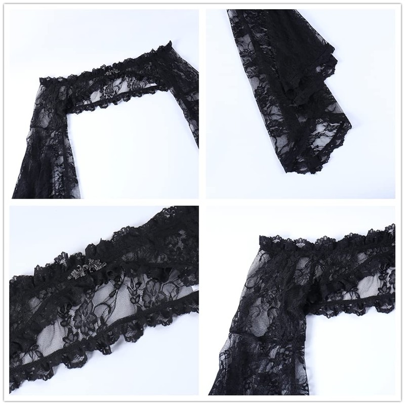 - The gothic lace shawls for women feature large flared sleeves, solid color, light, big bell long sleeves, and goth cropped top. Rave top, lacy shrugs for evening dresses.