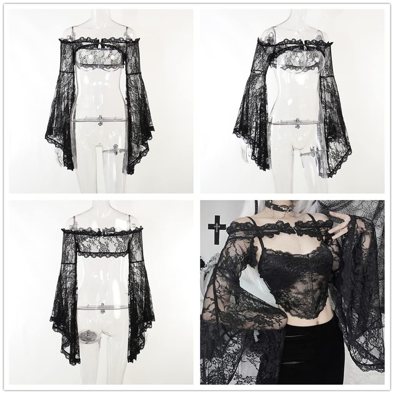 - The gothic lace shawls for women feature large flared sleeves, solid color, light, big bell long sleeves, and goth cropped top. Rave top, lacy shrugs for evening dresses.