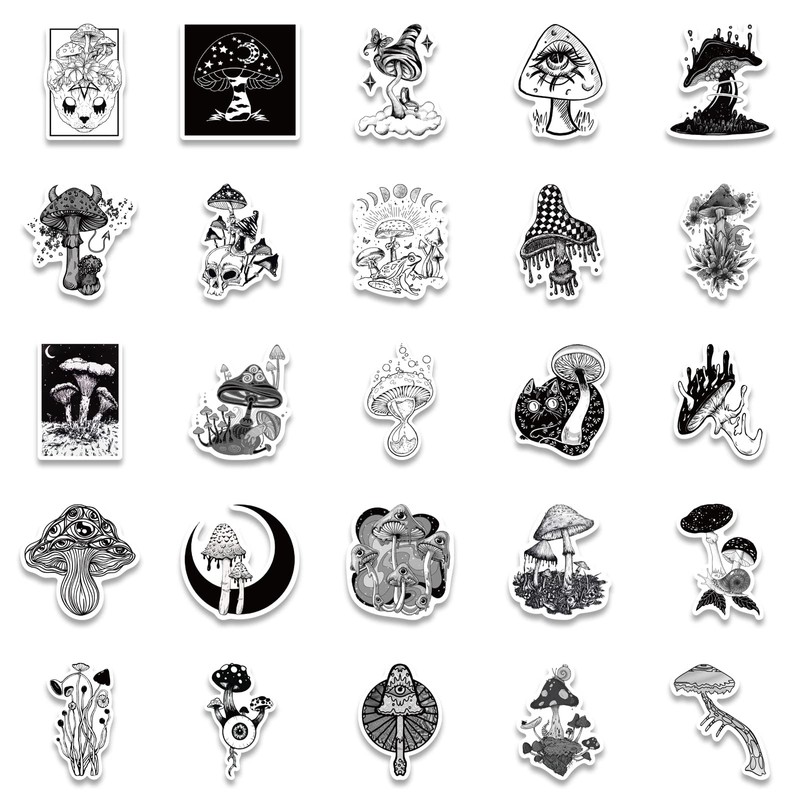 Goth Style Mushroom Stickers Pack Gothic Stickers Aesthetic Pack of 50 Black and White Waterproof Decorative Vinyl Small Stickers for Guitar, Water Bottle, Luggage, Tablet, Phone, Notebook