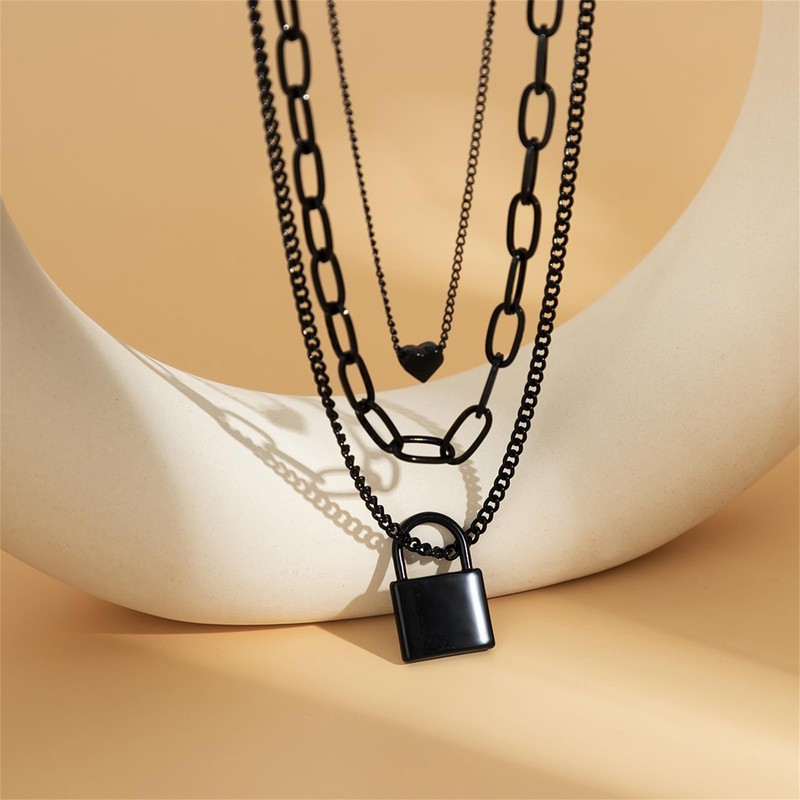 Gothic Black Layered Necklace,Chunky Black Necklaces Multilayer Moon Star Heart Lock Choker Herringbone Paperclip Chain Necklace for Women Trendy Dark Stackable Necklaces Fashion Jewelry (Lock)