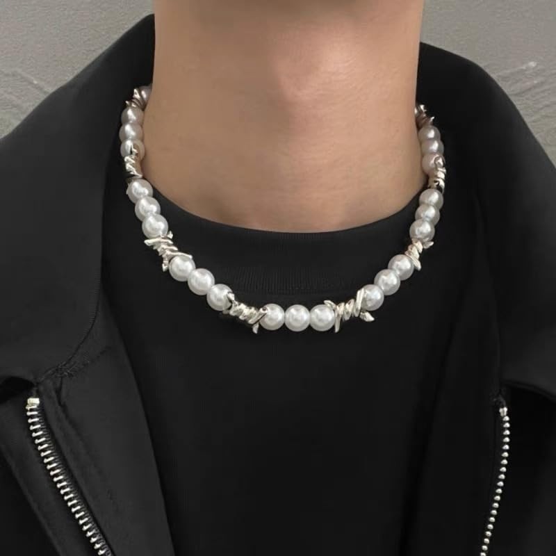 Gothic Thorns Pearl Choker Punk Hip Hop Necklace for Women Men Rock Stylish Chunky Pearls Beaded Goth Barbed Wire Chain Adjustable Collar Statement Necklaces Harajuku Streetwear Brambles Jewelry Gifts