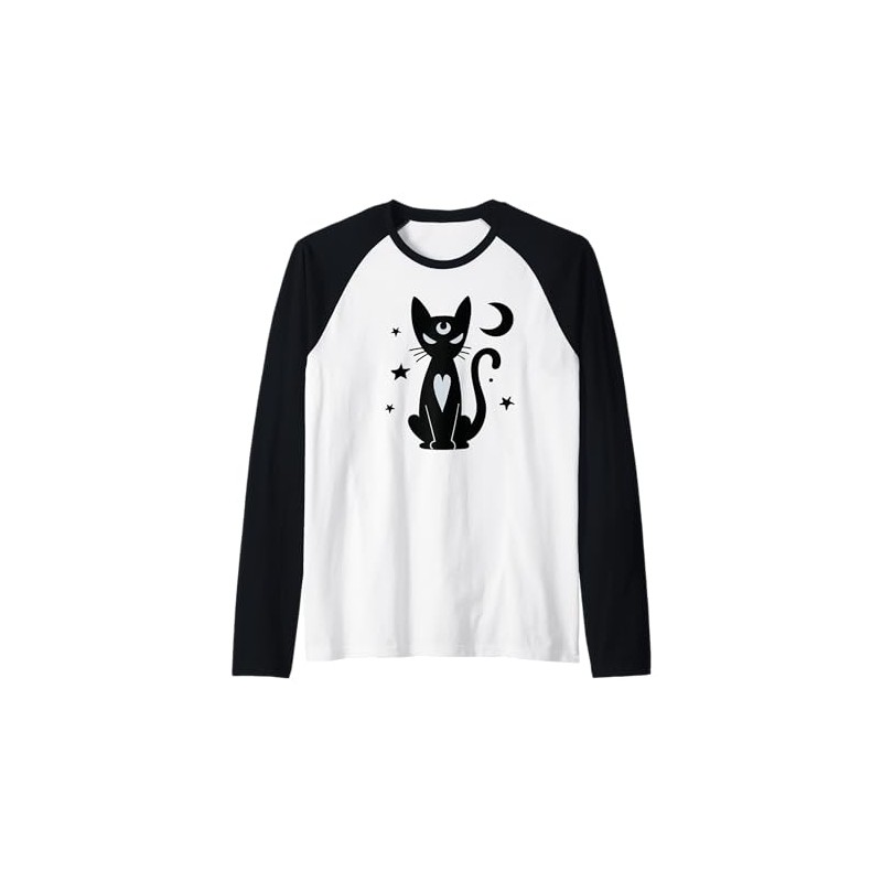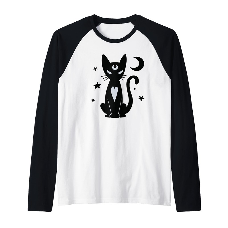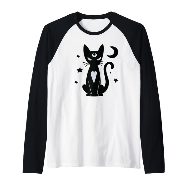 Gothic Witchy Black Cat with Moon Mystical Stars Night Art Raglan Baseball Tee
