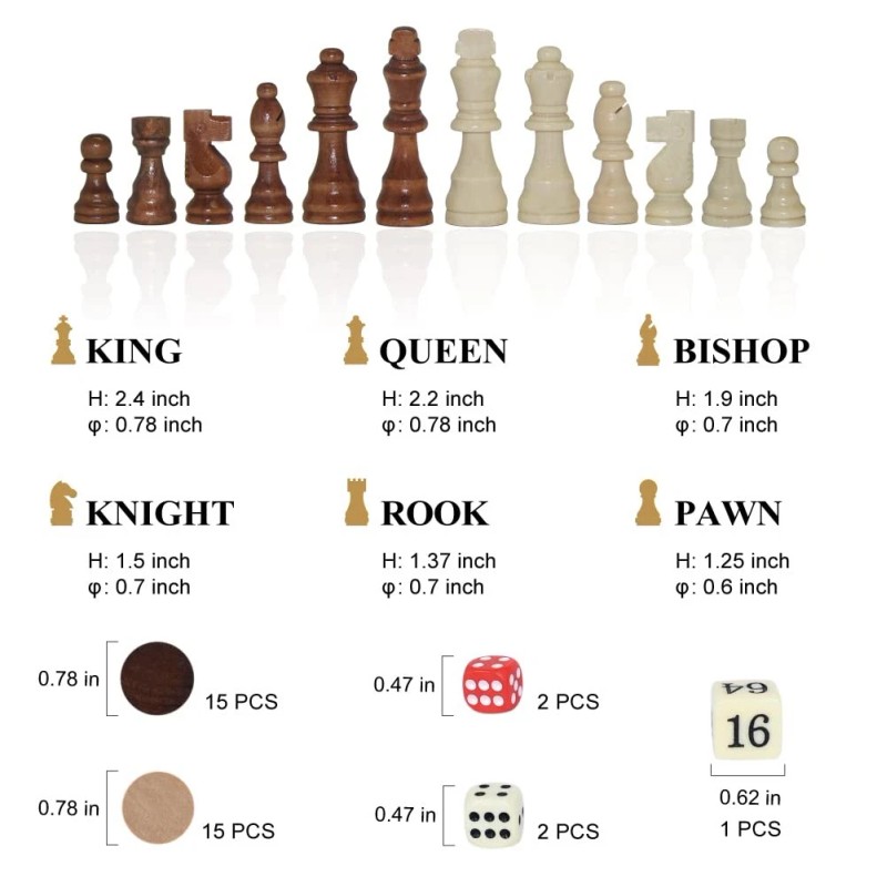 【COMPLETE SET, GREAT GIFT IDEA】Includes 32 chessmen, 30 backgammon/checker pieces, 2 pairs of dice, and a doubling cube - everything you need to play! This chess board set integrates chess, backgammon and checkers, which greatly improves the playability of the game. Our set is perfect for kids and adults alike, and makes a great gift for birthdays, holidays, or any occasion.