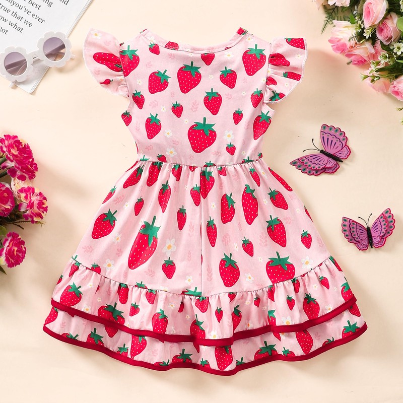GOTHLETIC Toddler Pink Strawberry Dresses Girls Summer Flutter Sleeve Shirred Dress Kids Spring Sundress Summer Clothes Size 6 (615)