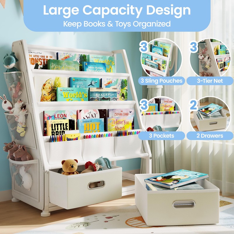 - 【Two Drawers for Extra Storage】Toddler bookshelf with pull-out drawers, perfect for keeping small items neatly stored yet easily accessible for kids. Storage of building blocks, small trucks, plush animals, and model cars. The sling bookshelf save bedroom space and keep a clutter-free environment