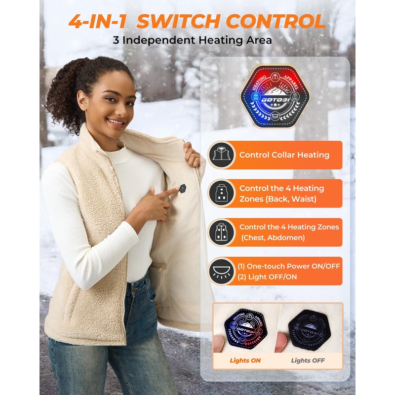 - Ergonomics All-area Heating: GOTOBI fleece women's heated vest has 9 carbon fiber heating elements cleverly arranged around the collar, back, waist, chest and abdoment, warming the entire body.
