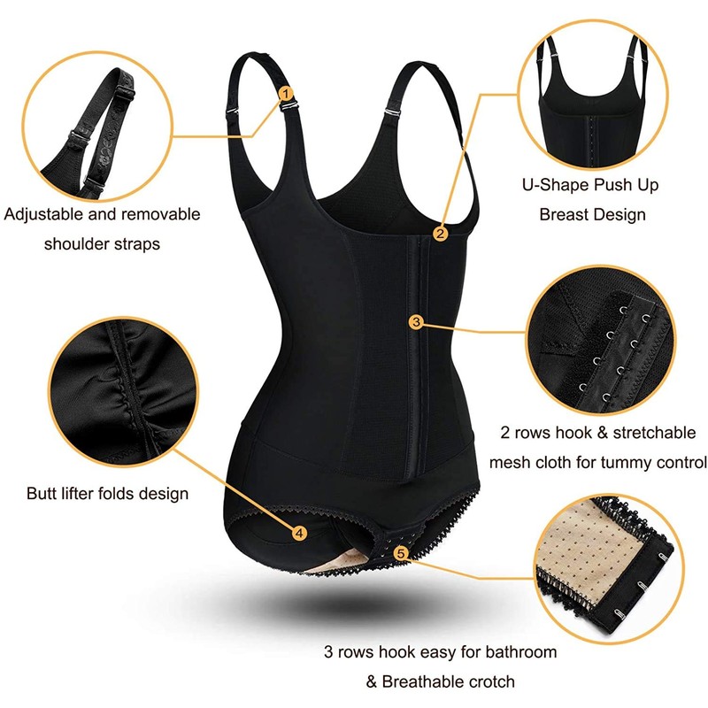 - ★【 U-SHAPE PUSH UP BREAST STYLE 】Special front U-type anti-droop open bust bodysuit makes your chest more erect and attractive. The waist cincher jumpsuit comes with adjustable & removable straps is more convenient to adjust this weight trainer girdle, effectively firm control armpit & back flabby fat. Hide unwanted bulges and give you a beautiful hourglass figure, remains breathable/sweat free/moisture wicking and comfortable to be worn with your own bra all day long.