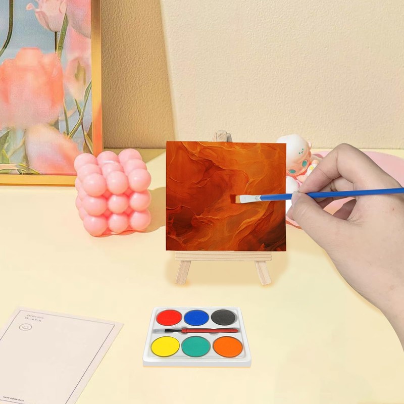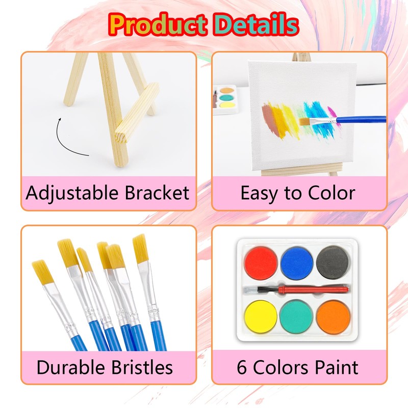 - 🎨[23pcs easel canvas set] The mini canvas easel kit including 6pcs mini easels, 6pcs art canvases, 6pcs paint brushes and 6pcs paint. A complete set can meet your painting needs.