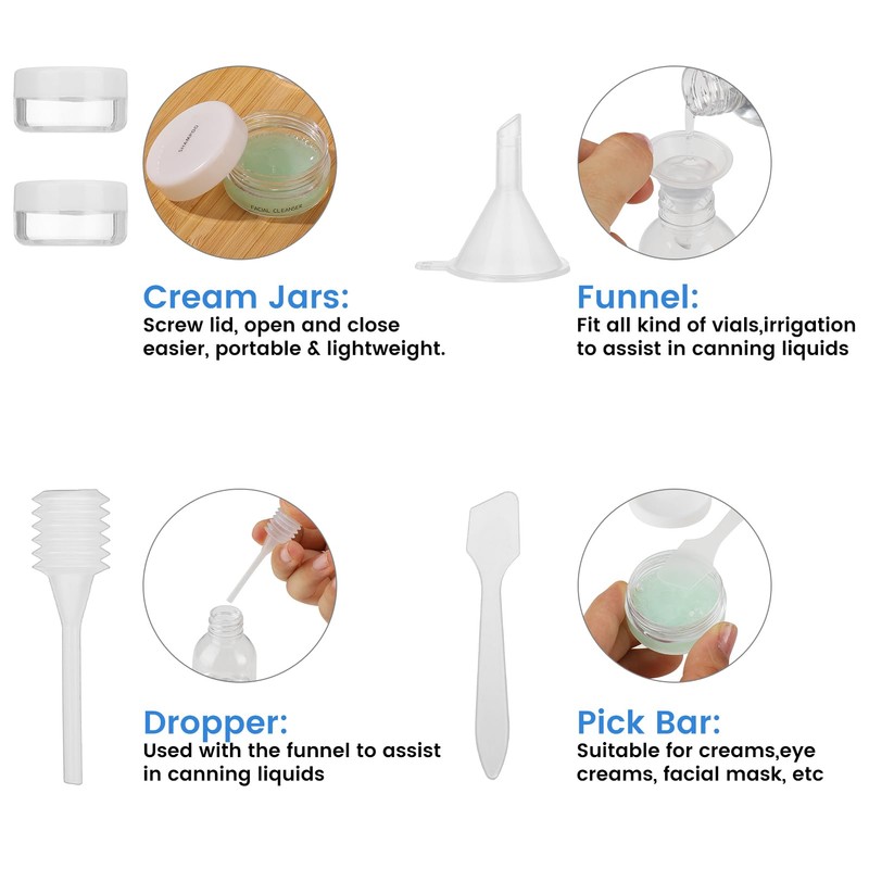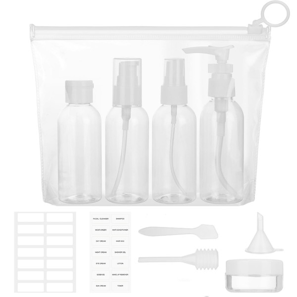 - ⭐【Exquisite Set】The travel bottle set include 1x 80ML flip-cap bottles, 1x 80ML spray bottle, 1x 80ML pump bottle, 1x 80ML lotion bottle, 1 x 10ml cream jars,1x pipette, 1x funnel, 1x spatula, 1x clear toiletry bag, 2x cosmetic labels.