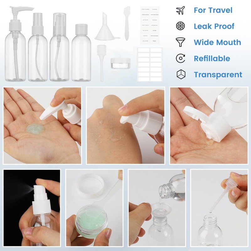 1. Leak proof transparent travel bottles with two labels that can use to differentiate toiletries.