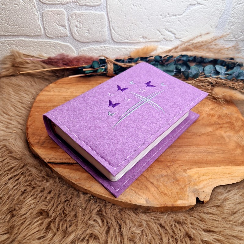 Gotteslob - Hülle aus Wollfilz - Kreuz - Schmetterlinge - flieder - Geschenk zur Kommunion, Geburt oder Taufe