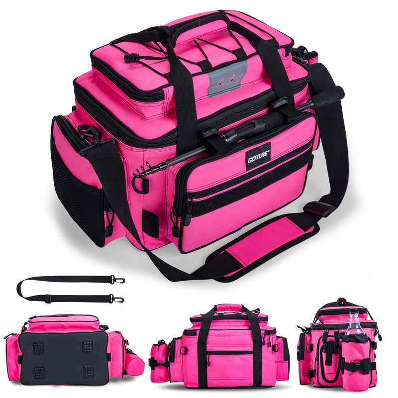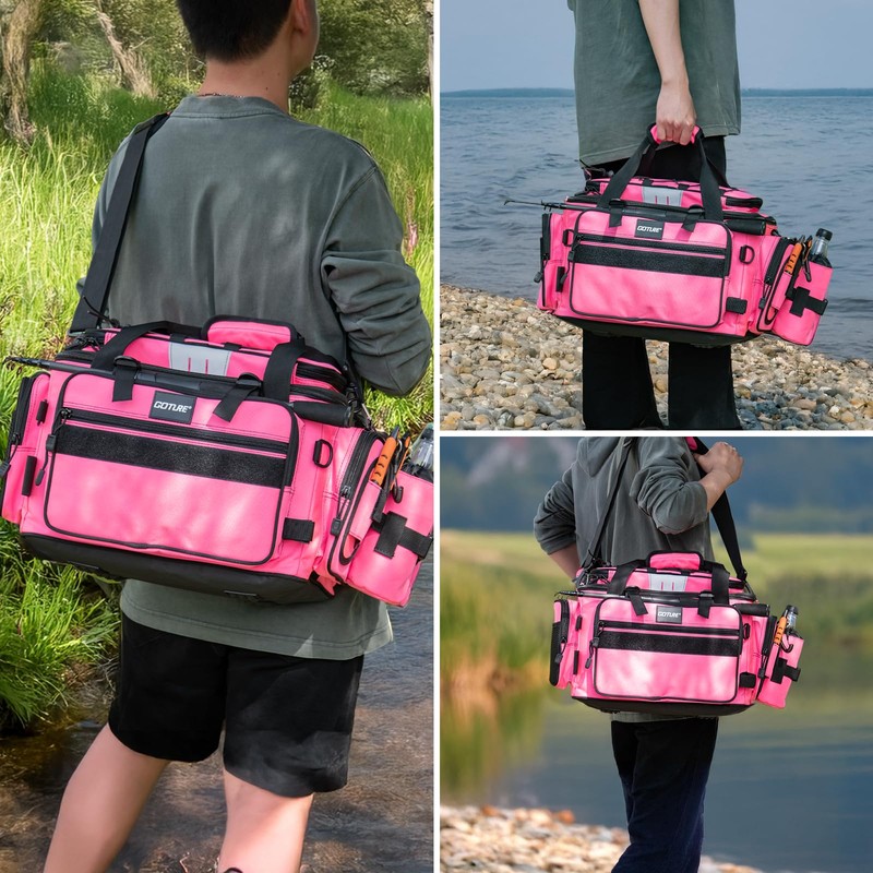 Goture Fishing Tackle Bag, Store Up to 4PCS 3700 Plus 2PCS 3600 Tackle Trays(Not Included), 600D Soft Side Gear Fishing Bag with Rod Straps,Detachable Water Bottle Pouch,Waterproof Bottom,SBS Zippers