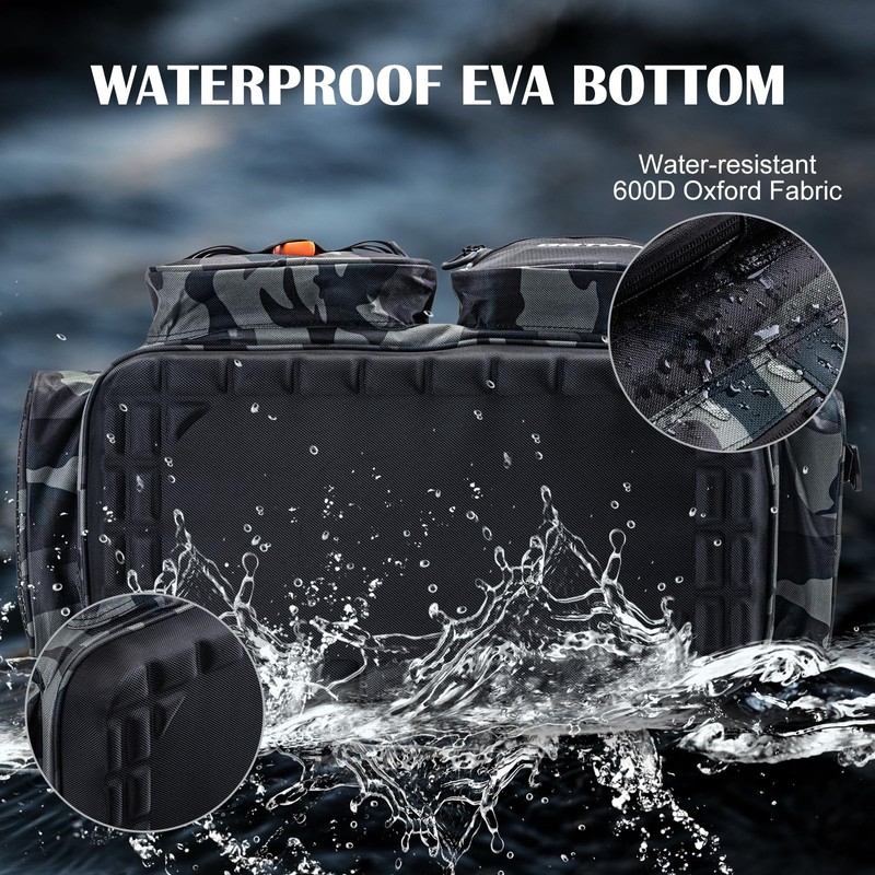 - Sturdy and Water-Resistant: Our tackle bag is constructed with 600D waterproof Oxford fabric, ensuring long-lasting wear resistance and scratch protection. The pearl cotton and PVC layers on the inside provide dual protection, and the bottom adds an extra layer of EVA waterproof material to ensure your fishing tackle is protected from damage and the elements