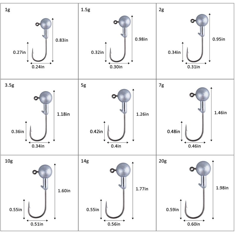 - Meets most fishing needs: Our jig hook fishing hook comes with a practical fishing box and is available in a variety of sizes, including 1g, 1.5g, 2g, 2.5g, 3.5g, 5g, 7g, 10g, 14g, 20g