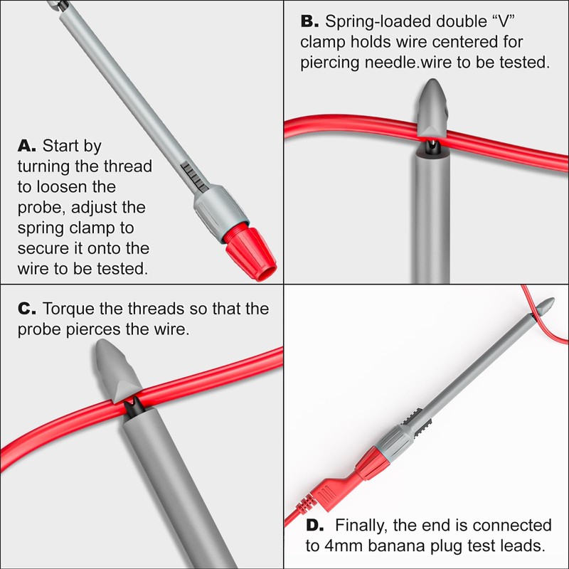 - Multimeter wire piercing probes are made of stainless steel and plastic, resistant to cold and high temperatures for more flexible use. Spring loaded double “V” clips hold the lead in the center of the piercing pin.