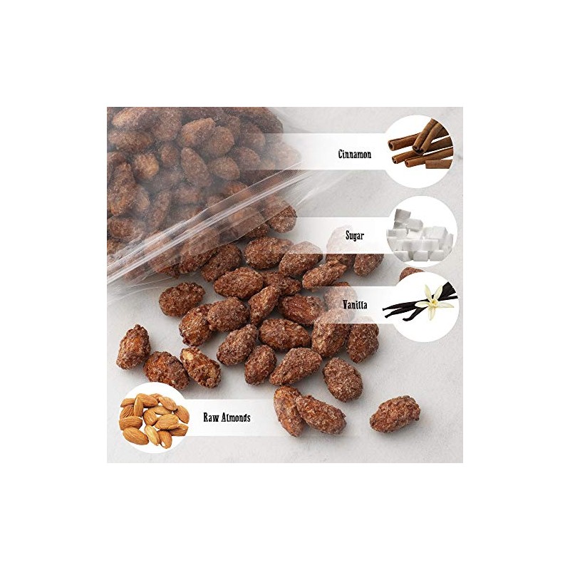 - An Irresistible Sweet Treat: Our cinnamon sugar glazed almonds are a treat that you can’t stop once you start. After the first bite, you’ll fall in love with the sweet vanilla and cinnamon flavor, tied together with our fresh Californian grown almonds.
