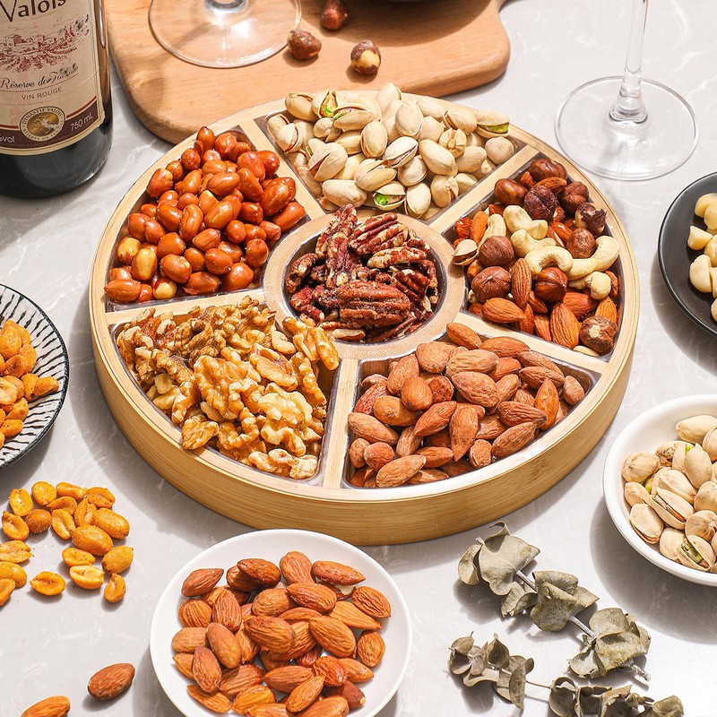 - Artisan Craftsmanship in Every Platter: The perfect centerpiece for any occasion, this christmas gift baskets for families is presented on a round wooden platter that epitomizes artisan elegance. The craftsmanship speaks of quality, making more than just a nut gift basket.