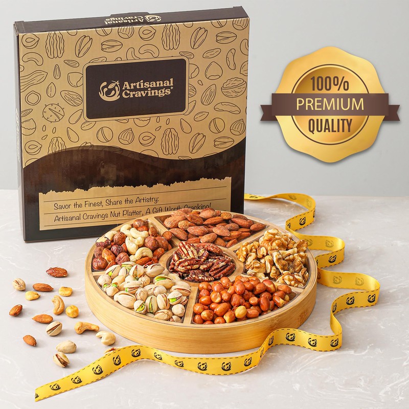 - Exquisite Selection of Superior Nuts: Delight in our Artisanal Cravings Gourmet Nut Platter, beautifully arranged on a round wooden platter. This elegant 1.5 lbs assortment includes 6 superior nuts: Almonds, Walnuts, Honey Glazed Pecans, Cashews, Pistachios, and a special Mixed Nuts medley, offering a truly refined snacking experience in every bite.