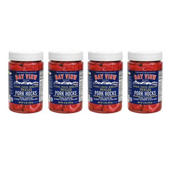 Bay View Packing Company pork hocks are cut from a full pork shoulder and center cut to give the meatiest and leanest hocks. The pork hock pieces (not whole pork hocks) are carefully sorted and only those which meet their highest standards are selected. They are sliced, trimmed, and packed by hand. Enjoy this fully cooked pickled delicacy in three convenient 12-ounce PET plastic jars. Refrigeration is not necessary before and after opening when the hocks are below the brine level. The red color of the pork hocks comes from two sources. First, they are a cured product that turns it from the natural color of pork, which is a light brown, to red. Second, Red #40 is added to the brine to lock in the cured color. A delicious no carb, high protein treat!