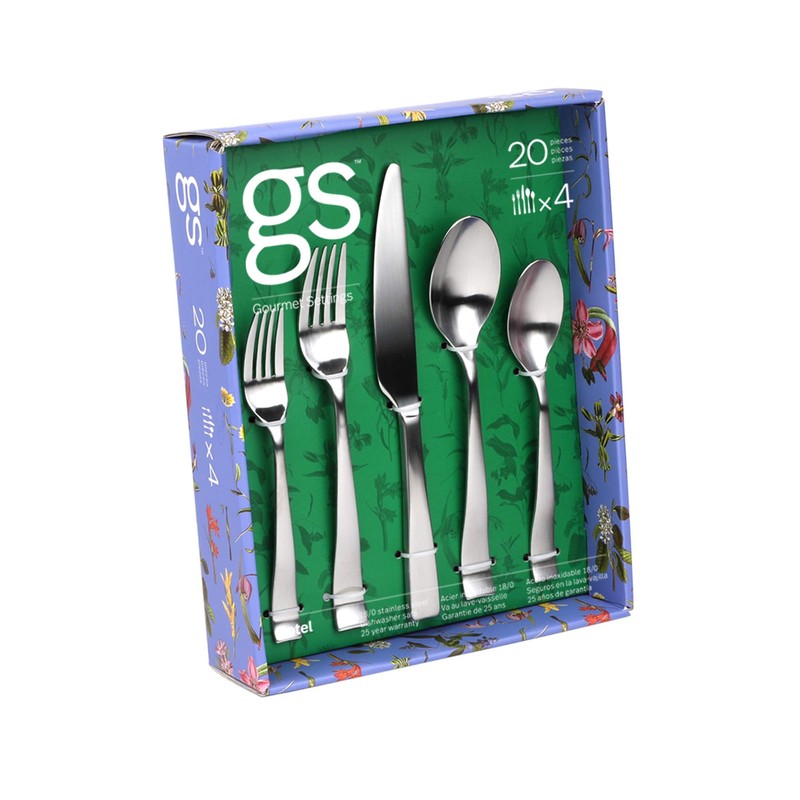 GOURMET SETTINGS At Gourmet Settings we are obsessed with design. We are constantly refining our flatware sets to ensure elite ergonomic integrity, timeless design, and a beautiful finish suitable for any occasion. All Gourmet Settings patterns have been meticulously designed, engineered and tested to be perfectly weighted and balanced, ensuring optimal performance and comfort you have to feel to believe. Our silverware sets are made with premium stainless steel and are to last for years to come. Every time you pick up your fork we want to bring a little smile to your face! QUALITY: Stainless steel and stain- free flatware sets focused on best design and size variety for comfort and performance. FINISH: Our sets maintain their finish perfectly without need for polishing and have been built for both strength and luster. SUITABILITY: Suited to everyday dining or casual occasions alongside any existing sets and tableware. WHAT'S INCLUDED? Salad fork (6 3/4") x 4 Dinner fork (8") x 4 Dinner knife (9 1/4") x 4 Tablespoon (8") x 4 Teaspoon (6 3/4") x 4
