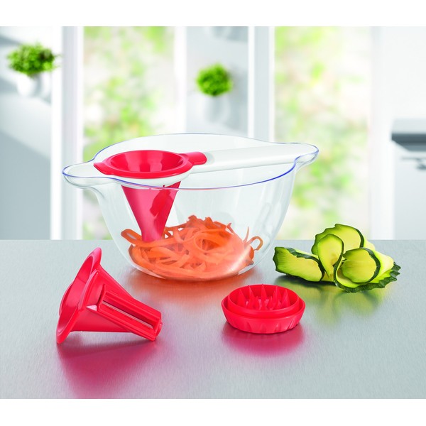 Spiral cutter with bowl "Gourmetmaxx" 5 pieces. Colour: white/red in coloured box. Dimensions: 24 x 18 x 10.5 cm with practical drip bowl, for vegetarian and healthy cooking. Blades made of high-quality stainless steel, practical drip bowl for storing or serving. With finger protection for safe working. Easy to clean in the dishwasher. Box contents: 1 set in coloured box, manufacturer no. 4016471065529