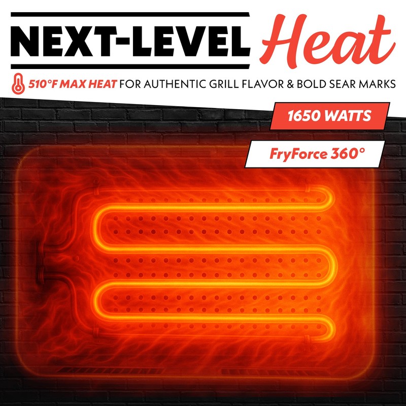 - Cast Iron Grate + 1650W Power – The heavy-duty cast-iron grill grate heats up to 510°F, locking in juices and delivering char-grilled results faster and more evenly