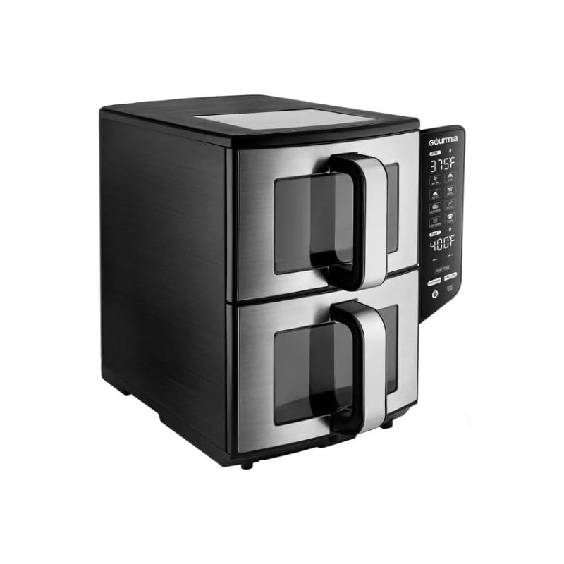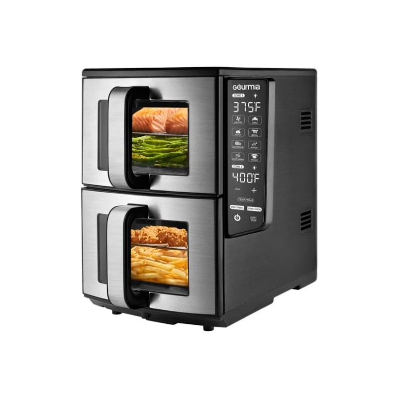 Meet the Gourmias GAF1190, the ultimate dual basket air fryer engineered for busy kitchens. With stacked 5.5-quart baskets, this 11-quart powerhouse delivers double the cooking space in a compact vertical footprint. Whether you’re crisping fries, roasting vegetables, or dehydrating fruit, eight one-touch presets—Air Fry, Bake, Roast, Broil, Dehydrate, Reheat, Keep Warm, Proof—cover every recipe need at temperatures from 90°F to 400°F. FryForce 360° Technology circulates superheated air around each basket, giving you golden, crispy results with minimal oil. Take complete control with the intuitive touchscreen LED display: set temperature, time, and toggle between Fahrenheit and Celsius for precision cooking. Innovative Smart Finish and Sync Cook modes let you coordinate complex meals. Sync Finish aligns different cook times so proteins and sides finish together; Sync Cook duplicates settings across both baskets for full-capacity batch cooking without guesswork Gourmias 11-QT. Four-layer cooking racks expand capacity, letting you prepare up to four dishes at once—perfect for meal prep and entertaining. Cleanup is a breeze: removable nonstick crisper trays and racks are dishwasher safe, and the sleek stainless steel housing wipes clean in seconds. Cord storage keeps counters clutter-free, while built-in lights and windowed baskets let you monitor progress without interrupting the flow. From weekday dinners to weekend feasts, the Gourmias GAF1190 Dual Basket Air Fryer redefines home cooking—delivering versatility, speed, and mouthwatering results every time.