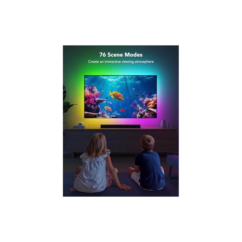- Music Sync: Govee TV lights allows the colors and brightness levels to sync with the rhythm, helping you create the vibe you need. You can also choose one of your favorite modes to suit your moods and enhance your TV-watching experience.