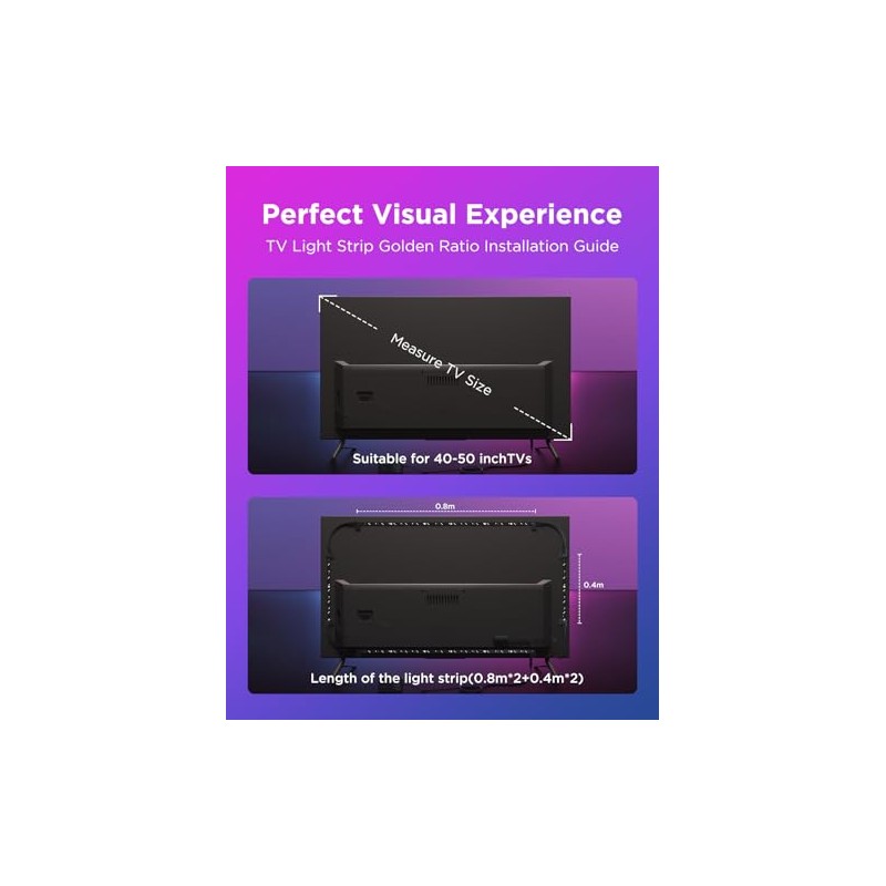 - Flexible Installation: This 2.4 M TV led backlight can cover 4 sides of 40-50 inch TVs. It is recommended to use the cable clips to secure the TV LED strip lights to make them snugly fit your TVs.