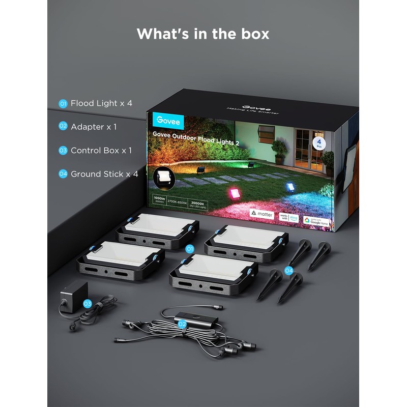 - Premium Outdoor Quality: No matter it's sunny, rainy or snowy, upgraded product structure and IP66 waterproof ensures your RGBIC flood lights stay functional in -4H to 104H environment. The control box is IP65 and the power adapter is IP44 rated.