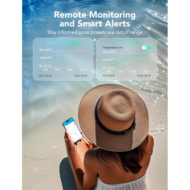 - Intelligent Monitoring and Alert: Set your preferred temperature and humidity range,and the APP will alert you via cell phone when the smart hygrometer thermometer detects readings outside of the range. Respond faster to sudden changes in the greenhouses, bedroom temperature, and more.