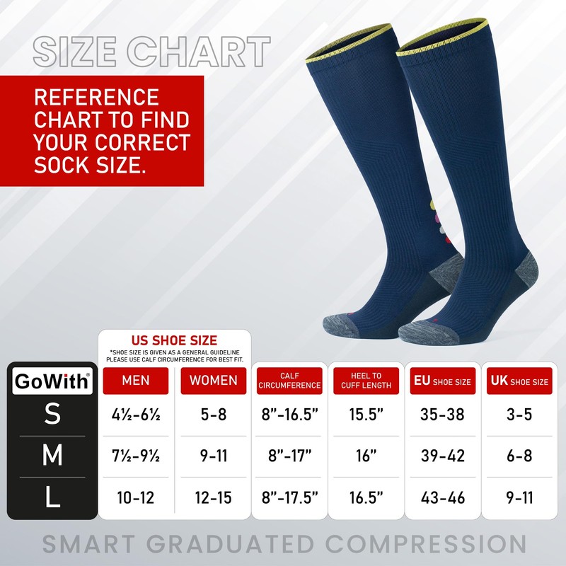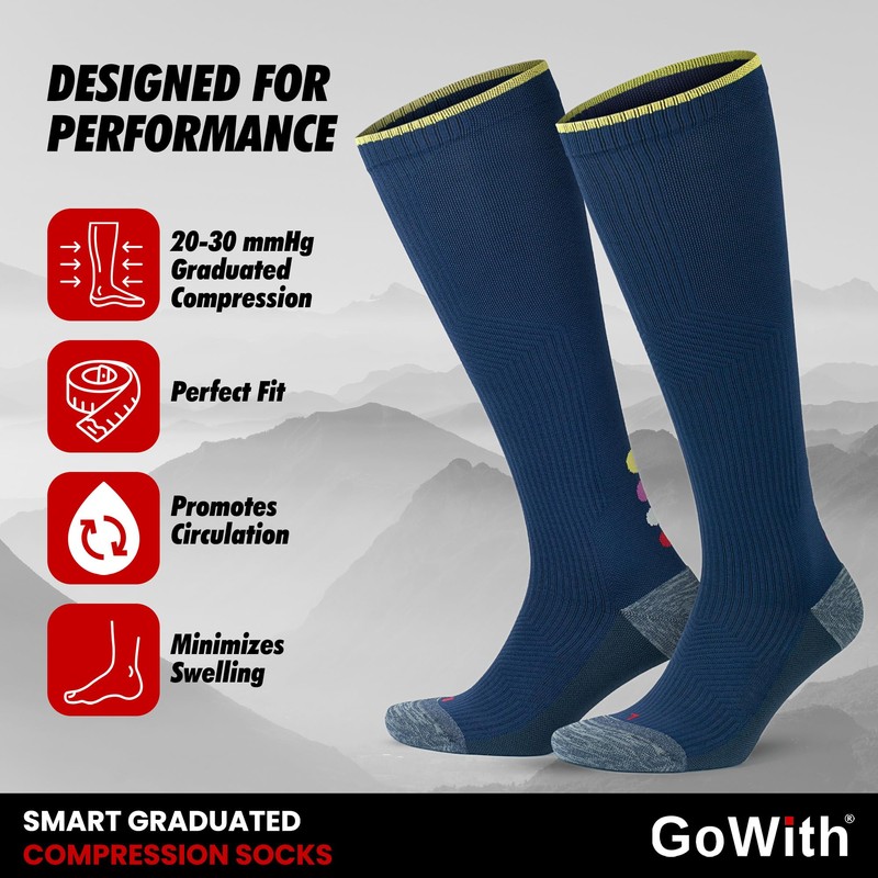 GoWith 2 Pair Unisex Graduated Compression Socks, 20-30 mmHg Sport Cushioned Circulation Support Knee High Socks for Men & Women, Dark-Blue, Large, Model: 3595
