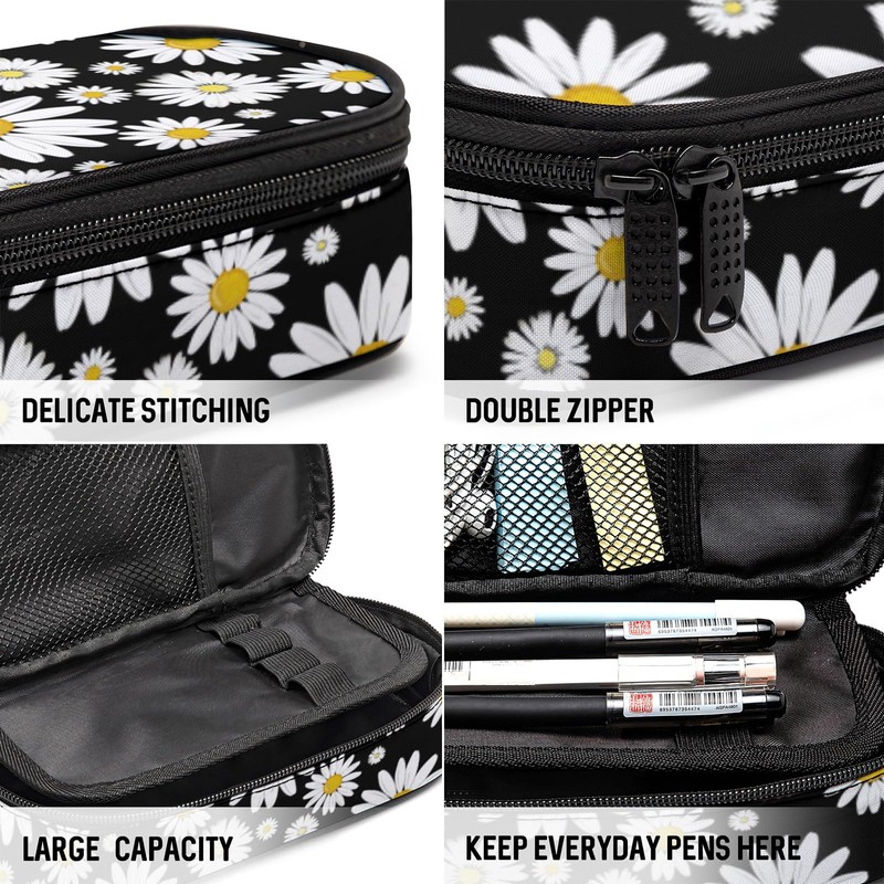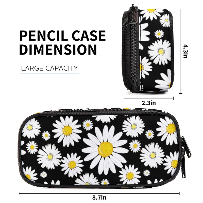 - Large capacity:The Little daisy pen case for student measures 8.7 * 4.3 * 2.3 inches with one large pocket capable of holding major office supplies.There is a compartment in the center that can hold four pens,and a mesh pocket at the top for storing headphones and other small items.The reasonable and scientific partitioning allows you to bid farewell to clutter