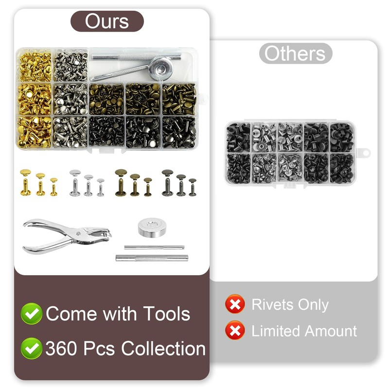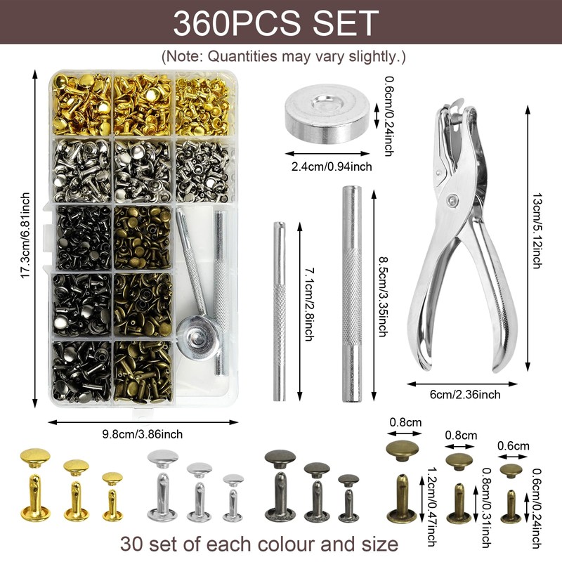 - Package includes: you will receive an impressive collection of 360 double cap leather rivet sets, available in 3 versatile sizes and 4 elegant colours. This comprehensive metal hollow rivets set ensures that you have the perfect rivets for a variety of projects.