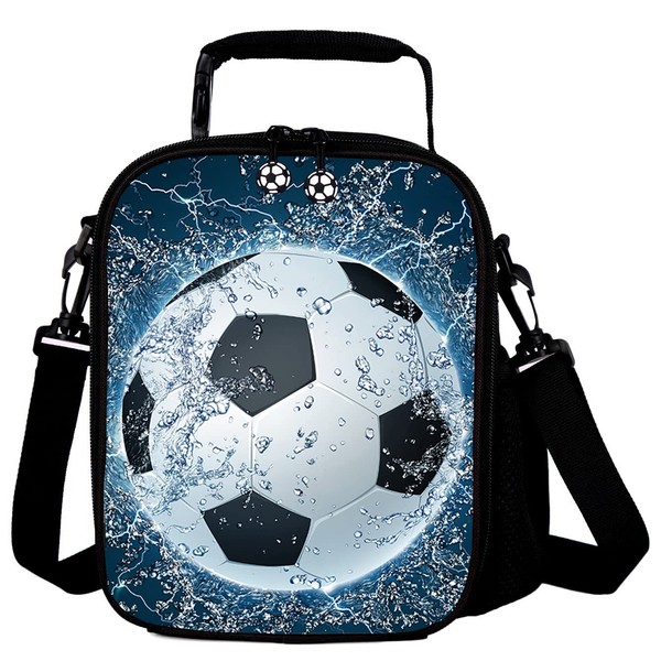GOXUNYUAN Kids 3D Football Printed Lunch Bags Reusable Cooler Warm Tote Lunch Box with Drink Bottle Holder Children Portable Shoulder Strap Thermal Picnic Bags for Boys Girls Blue