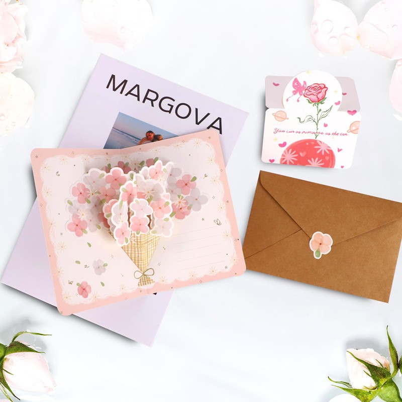 - [Exquisite combination outfit] Our 1st anniversary card set is carefully matched, including a 3D flower greeting card, a set of adhesive stickers, a textured kraft paper envelope, and a beautiful rose folding cardboard. Each one carries your heart, waiting to be given life.