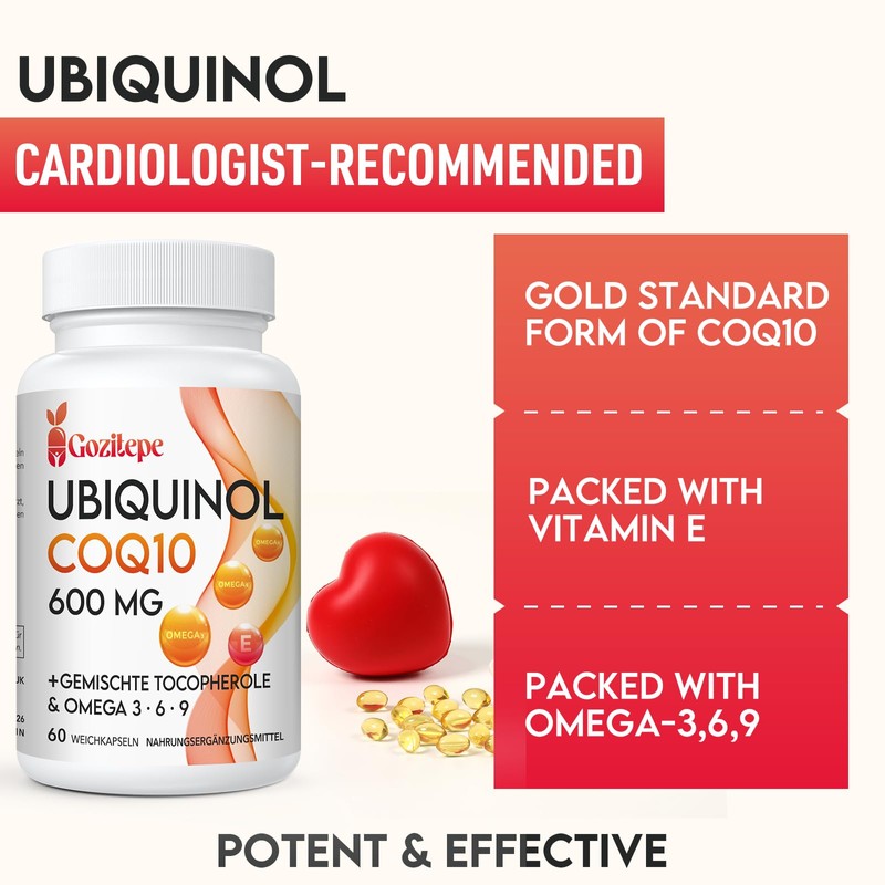 - Gozitepe Ubiquinol CoQ10 C Zusammensetzung und Dosierung: Gozitepe Ubiquinol CoQ10 enth?lt pro Portion (2 Weichkapseln) 600 mg Ubiquinol, 100 IE Vitamin E und 300 mg Omega-3,6,9-Fetts?uren. Diese Kombination aus Inhaltsstoffen bietet eine einfache M?glichkeit, die Ern?hrung mit wichtigen N?hrstoffen zu erg?nzen, die in verschiedenen Lebensmitteln vorkommen.