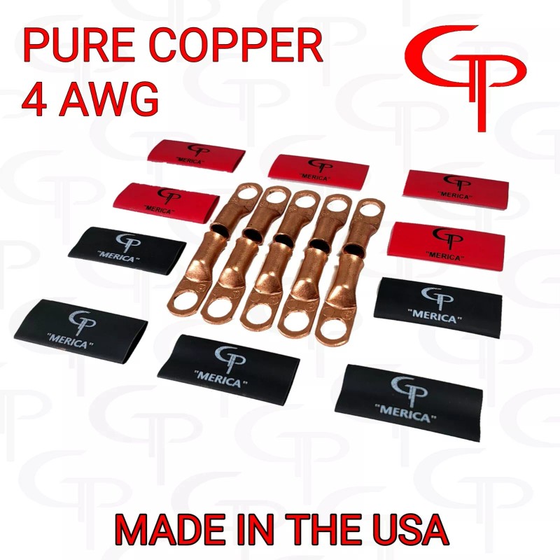 GP AUDIO (10) 4 AWG Gauge Copper Lugs w/ RED & BLACK Heat Shrink Ring Terminals wire