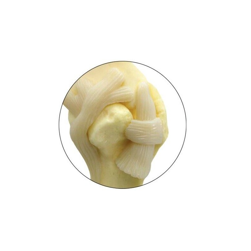 This anatomical model features an average sized dog shoulder with scapula, humerus, biceps brachii tendon, coracobrachialis tendon, lateral glenohumeral ligament, medial glenohumeral ligament and transverse humeral ligament.